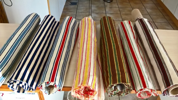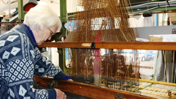 I åbningstiden bliver der ikke vævet, fordi de gamle væve larmer meget, men vi får en demonstration af en Jacquard-styret maskinvæv.