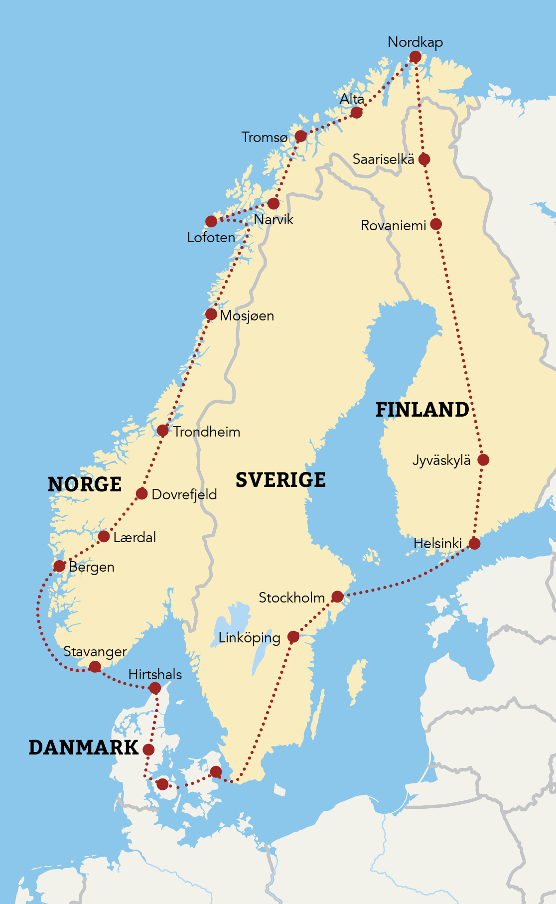 Turen starter med opsamling over hele Danmark, og vi kommer naturligvis forbi både Jylland, Fyn og Sjælland. Herefter går turen nordpå, og du vil opleve nordiske hovedstæder i Stockholm, Sverige og Helsinki, Finland. Turen går også til det unikke Lapland i det nordlige Finland, ligesom du kan glæde dig til flere store naturoplevelser i Nordnorge - både Gudbrandsdalen, Sognefjorden og Bergen. Endvidere oplever du på turen de smukke og unikke kirker, Nidaros Domkirke i Trondheim og Ishavskatedralen i Tromsø. I sidstnævnte katedral kan du særligt glæde dig til den uforglemmelige midnatskoncert.